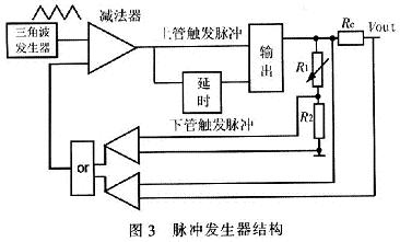 系統(tǒng)采用了電流負(fù)反饋電路,以適應(yīng)激光二極管的要求。當(dāng)負(fù)載變化,電流略大于給定電流時,減小ton寬度,電壓降低。電流略小于給定電流時,增加ton寬度,這樣可以維持電流穩(wěn)定。圖3所示為脈沖發(fā)生器結(jié)構(gòu)。