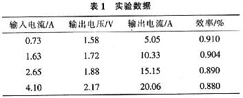 實(shí)驗(yàn)中用50 A的2個二極管串聯(lián)作為負(fù)載,輸入電壓12 V時,不同電流下輸出及效率如表1所示。