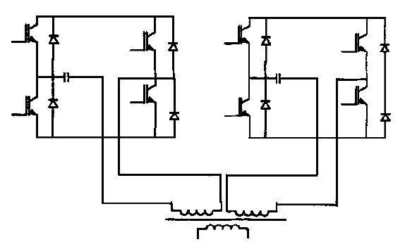 當(dāng)負載電容容量小且重復(fù)頻率高時, 一種設(shè)計思想是改進控制電路, 使其達到的效果相當(dāng)于: 在每一個充電周期開始階段, 使用諧振電流大的主電源快速充電至預(yù)設(shè)電壓, 隨后轉(zhuǎn)為小電流電源充電, 在T w 階段向負載提供很小的電量以減小波動; 另一種技術(shù)路線采用雙橋路的移相控制電路, 如圖7 所示,這種電路非常適合大功率充電的應(yīng)用場合。EM I 公司的30kJ/s , 50kV 電源采用了此項技術(shù)。