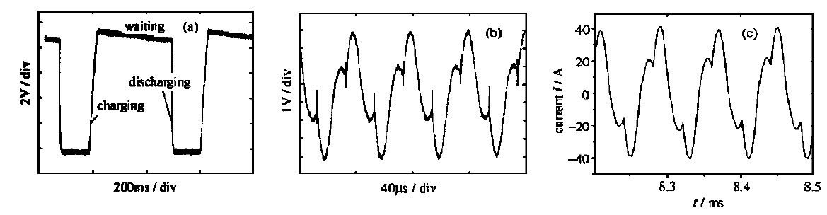 圖6 是某調(diào)制器充電電源波形圖, 該電源充電功率可達2kJ/s , 工作頻率12. 5kHz, 電壓30kV.測量用的示波器型號為泰克TDS3032.V s= 500V , C r= 0. 4uF,L r= 158uH, T s= 80us, 變壓器副邊為雙繞組,每繞組升壓比1∶40, Cload= 0. 66uF.實際電路中L r 完全利用了變壓器的漏感, 且漏感選擇較大以減小分布電容。圖6 (c) 是該電源諧振開關(guān)電流的仿真波形, 和實測波形比, 吻合得很好。