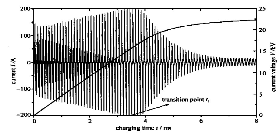 忽略回路電阻, 電路的特征阻抗為Z =√ L/C , 諧振周期為T r = 2π √L/C , 其中C 是諧振電容C r 和折合到原邊的負載等效電容C''串聯(lián)后形成的總電容, 通常因高壓變壓器變比高, 等效電容C ''和C r相比較大, 因此串聯(lián)后的總電容C 和C r 相差不大。完整的充電電流波形包絡(luò)及充電電壓如圖4 所示, 其中t1是轉(zhuǎn)折點, t1 以前是線性等臺階充電, t1 以前電流波形放大如圖5 (a) 所示, 轉(zhuǎn)折點附近的電流波形如圖5(b) 所示。