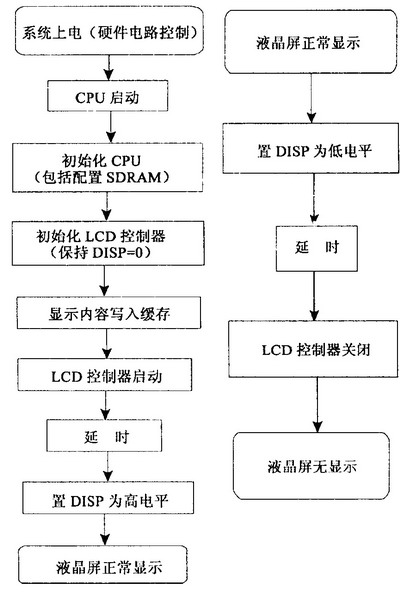 液晶顯示器啟動、關閉的測試流程圖如圖6。其中LCD控制器的初始化最為重要,須依照液晶顯示模塊的要求配置CPU的寄存器和延時時間。