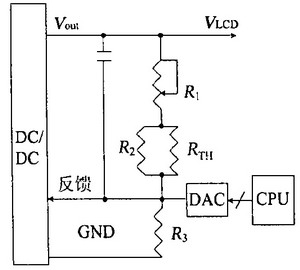 液晶顯示器對比度的調(diào)節(jié)可分為硬件調(diào)節(jié)和軟件調(diào)節(jié)。圖5的電路具有軟、硬件調(diào)節(jié)功能。其中R1是可調(diào)電阻,可調(diào)節(jié)VLCD的電壓,從而液晶顯示器的對比度得到調(diào)節(jié);電路中還可利用CPU與數(shù)模轉(zhuǎn)換器(DAC)相結合來控制DC/DC的反饋端的電壓,從而實現(xiàn)軟件調(diào)節(jié)液晶顯示器的對比度。