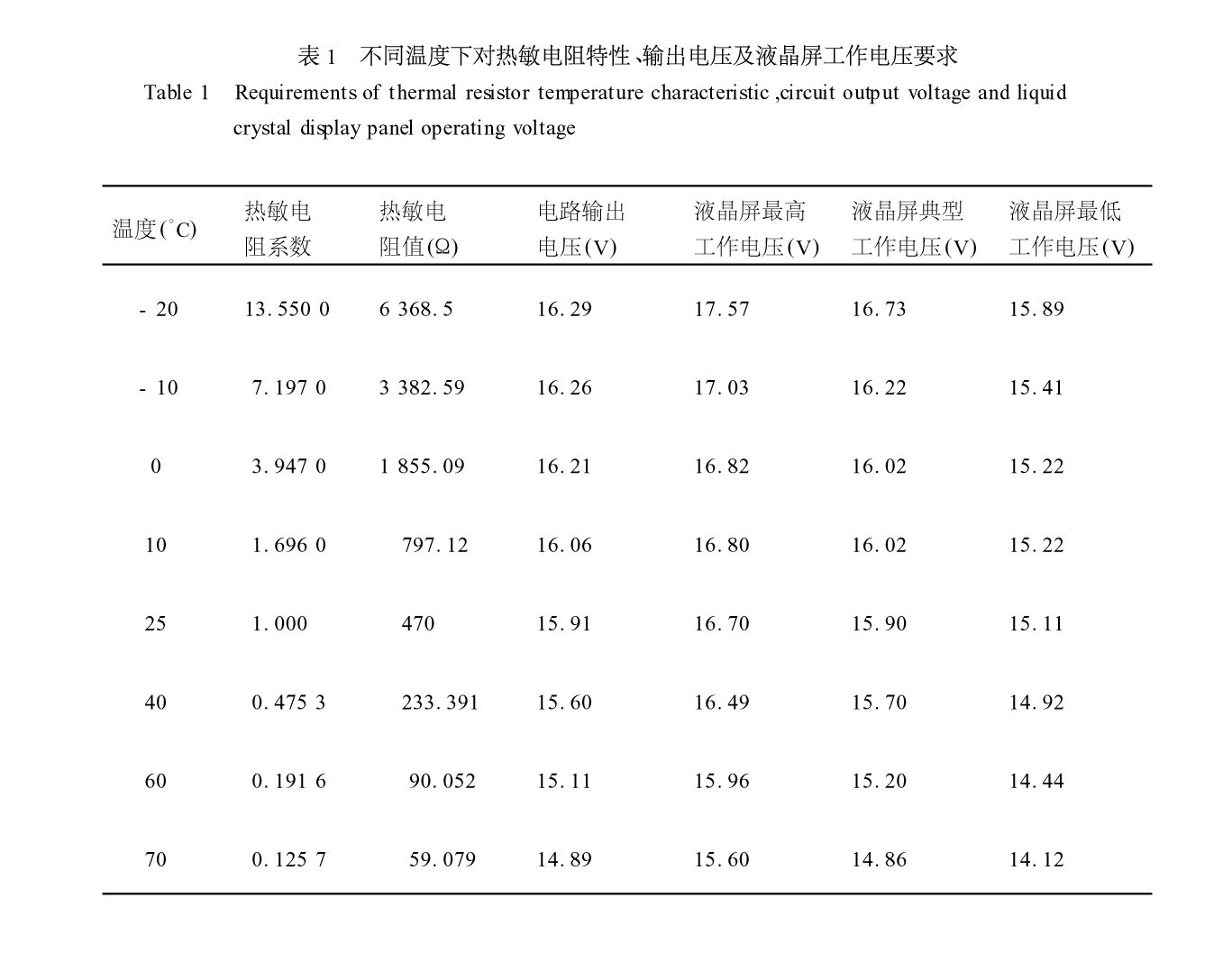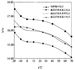 進行了模擬計算,結果如表1,由表1所得曲線如圖4。表1和圖4表明電路輸出和液晶屏的要求吻合,電路能夠保證液晶在-20~70°C 范圍內(nèi)正常顯示。而且高、低溫測試結果證實,在-20~70 °C范圍內(nèi)對比度正常。