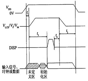 所有液晶顯示器對于上電、下電時序都有嚴格要求。如果上電、下電時序不符合要求,則不能正常顯示,常常會出現(xiàn)亂碼、鎖存、殘留顯示等現(xiàn)象。以日本日立公司驅(qū)動芯片HT66130/HT66137驅(qū)動320×240液晶顯示屏為例,對上電、下電時序的要求如圖3所示,一般液晶顯示驅(qū)動芯片要求也大致如此。