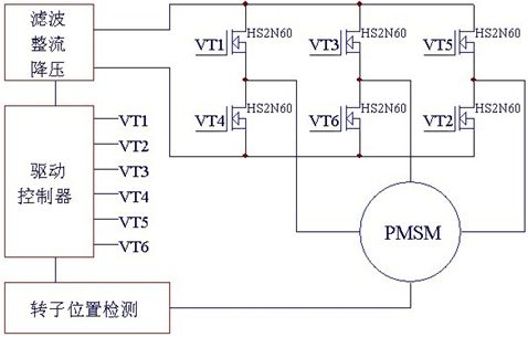 方案中無刷直流電機(BLDCM)輸入(110V/220V)交流電,經(jīng)轉(zhuǎn)換器(converter)轉(zhuǎn)成直流,要轉(zhuǎn)入電機線圈前須先將直流電壓由換流器(inverter)轉(zhuǎn)成3相電壓來驅(qū)動電機。換流器(inverter)由6個功率MOSFET(VT1~VT6)分為上臂(VT1、VT3、VT5)/下臂(VT2、VT4、VT6)連接電機作為控制流經(jīng)電機線圈的開關。MCU提供PWM(脈沖寬度調(diào)制)決定功率MOSFET HS2N60IB開關頻度及換流器(inverter)換相的時機。