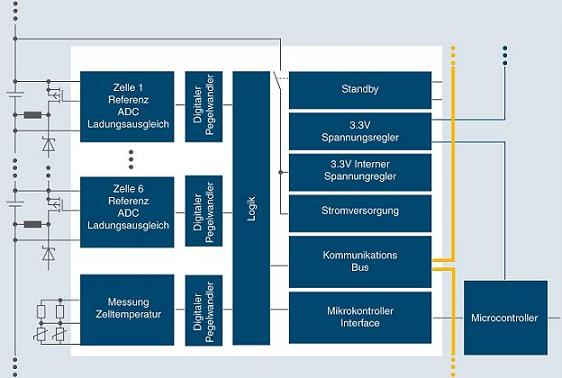 電池管理電路的核心由6個高精度12位模數轉換器組成。每個電池單元由一個單獨的模數轉換器監(jiān)控。這種方法具有很多優(yōu)點,一方面可以同時測量所有的電池單元,另一方面,電池單元電壓無須傳輸模擬地,因而不會降低系統(tǒng)的準確度。除了提供有效的平衡,優(yōu)化電池單元容量的另一必要條件是精確記錄電池單元電壓,因為鋰離子電池具有非常平坦的特性曲線。因此在模擬/數字轉換后,電路傳輸數字電壓值而不會有準確度的損失。