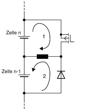 一旦線圈已經從通過晶體管放電的電池單元中去耦,電感中儲存的能量可通過一個二極管對鄰近電池充電。因而電荷可以在兩個單獨的電池單元之間來回地移動,實現極高效率并且?guī)缀鯚o損耗。此方法具有某些決定性的優(yōu)點: