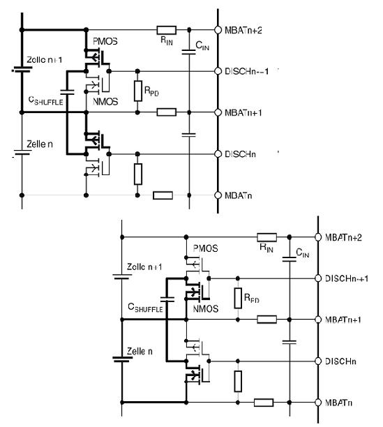 類似的情形也會在放電時發(fā)生。與前相反,情況是某個電池單元早已完全放電,而其它的電池單元仍然具有足夠的能量可繼續(xù)為汽車提供動力(理論上的)。然而,這時汽車不可能繼續(xù)行走,因為這會使較弱的電池單元過度放電,結果會導致電池單元的損毀。為了避免上述兩種這些情況的發(fā)生,單個電池單元之間的主動平衡是必須的。