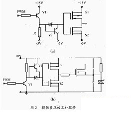 功率MOSFET屬于電壓型控制器件,只要柵極和源極之間施加的電壓超過其閾值電壓就會(huì)導(dǎo)通。由于MOSFET存在結(jié)電容,關(guān)斷時(shí)其漏源兩端電壓的突然上升將會(huì)通過結(jié)電容在柵源兩端產(chǎn)生干擾電壓。常用的互補(bǔ)驅(qū)動(dòng)電路的關(guān)斷回路阻抗小,關(guān)斷速度較快,但它不能提供負(fù)壓,故其抗干擾性較差。為了提高電路的抗干擾性,可在此種驅(qū)動(dòng)電路的基礎(chǔ)上增加一級(jí)由V1、V2、R組成的電路,產(chǎn)生一個(gè)負(fù)壓,電路原理圖如圖2(a)所示。