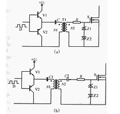 圖1(a)為常用的小功率驅(qū)動(dòng)電路,簡(jiǎn)單可靠成本低。適用于不要求隔離的小功率開關(guān)設(shè)備。圖1(b)所示驅(qū)動(dòng)電路開關(guān)速度很快,驅(qū)動(dòng)能力強(qiáng),為防止倆個(gè)MOSFET管直通,通常串接一個(gè)0.5~1Ω小電阻用于限流,該電路適用于不要求隔離的中功率開關(guān)設(shè)備。這兩種電路結(jié)構(gòu)特簡(jiǎn)單。