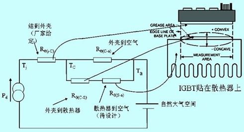 圖2中:rθ(j-c)是器件結(jié)到管殼基準(zhǔn)點(diǎn)穩(wěn)態(tài)熱阻,由制造廠家提供,一般在數(shù)據(jù)表中給出上限值或給出瞬態(tài)熱阻曲線取t→∞的穩(wěn)態(tài)值;rθ(c-a)是管殼未通過散熱器直接到空氣的熱阻,通常不考慮;rθ(c-s)是管殼到散熱器的觸熱阻,通常由制造廠家在數(shù)據(jù)表中給出;rθ(c-a)是散熱器基準(zhǔn)點(diǎn)到環(huán)境基準(zhǔn)點(diǎn)的熱阻,其值由散熱器形式、尺寸和冷卻方式?jīng)Q定;ta是環(huán)境溫度。
