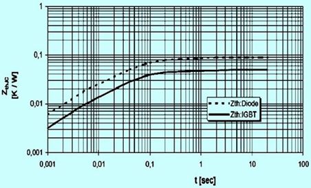 通常處于周期性脈沖功耗負(fù)載下的平均和最大結(jié)溫可以參考廠家所給出的瞬態(tài)熱阻曲線來計(jì)算。如圖3示出了eupc型號(hào)為bsm400ga120dlc的igbt模塊瞬態(tài)熱阻曲線zthjc=f(t)。