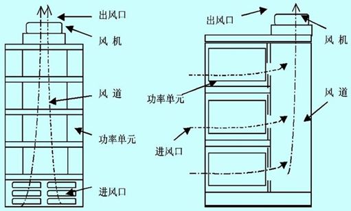 高壓變頻器常風(fēng)的冷卻方式主要為散熱器強(qiáng)制風(fēng)冷、循環(huán)水冷卻和熱管冷卻等。因強(qiáng)制風(fēng)冷方式簡單,不存在水冷時(shí)的凝露問題,以及熱管散熱器設(shè)計(jì)的復(fù)雜性,在確定合適的通風(fēng)結(jié)構(gòu)的情況下,一般采用此種方式。采用強(qiáng)制風(fēng)冷方式需要在結(jié)構(gòu)設(shè)計(jì)時(shí)考慮散熱風(fēng)道。散熱風(fēng)道的設(shè)計(jì)應(yīng)在充分考慮單元散熱的要求下,應(yīng)盡量優(yōu)化。常見的多電平串聯(lián)方式的高壓變頻器,從結(jié)構(gòu)上分為功率柜體、變壓器柜、控制柜。功率柜風(fēng)道設(shè)計(jì)通常有兩種方式:串聯(lián)風(fēng)道和并聯(lián)風(fēng)道。