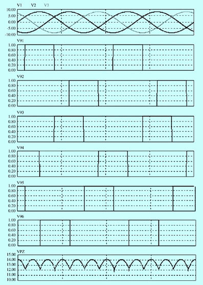 虛擬整流技術的實現(xiàn),主要通過三相同步檢測電路取得同步控制信號,然后控制功率器件來模擬二極管橋式整流電路對三相交流電進行整流,同時防止輸入的三相交流電相間短路。其原理如圖9所示,是一個輸出方向固定的虛擬整流電路。仿真波形如圖5所示,它們分別是矩陣變換單元的三相輸入電壓、6路同步信號和虛擬整流后得到的輸出電壓波形。