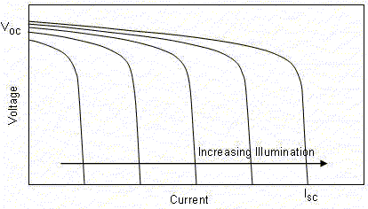 圖2所示為太陽(yáng)能電池的輸出特性,由于二極管的I-V特性存在微小的變化,串聯(lián)電阻(Rs)上的電壓降也存在微小的變化,但是,輸出電壓保持很大的恒定。然而,在一些點(diǎn)通過(guò)內(nèi)部二極管的電流是如此之小,以至于它變得偏置不夠,并且,隨著負(fù)載電流的增加,跨越它的電壓快速減少。最后,如果所有產(chǎn)生的電流流過(guò)負(fù)載并且不流過(guò)二極管的話,輸出電壓就為零。該電流被稱為太陽(yáng)能電池的短路電流(ISC),它與VOC一道是定義工作性能的主要參數(shù)之一。因此,太陽(yáng)能電池被認(rèn)為是“電流受限”的電源。當(dāng)輸出電流增加的時(shí)候,其輸出電壓降低,直到最終減少為零,如果負(fù)載電流達(dá)到其短路電流的話。