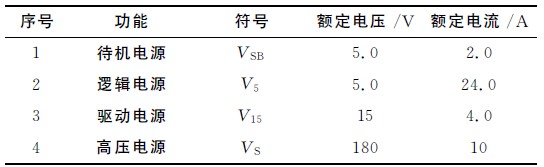 但本文設(shè)計的電源只為顯示系統(tǒng)提供大功率180V高壓和+5V 邏輯電壓及+15V 驅(qū)動電壓。顯示屏需要的其他高壓又每塊顯示屏的控制電路產(chǎn)生。表1為各種輸出電壓及負載能力表。