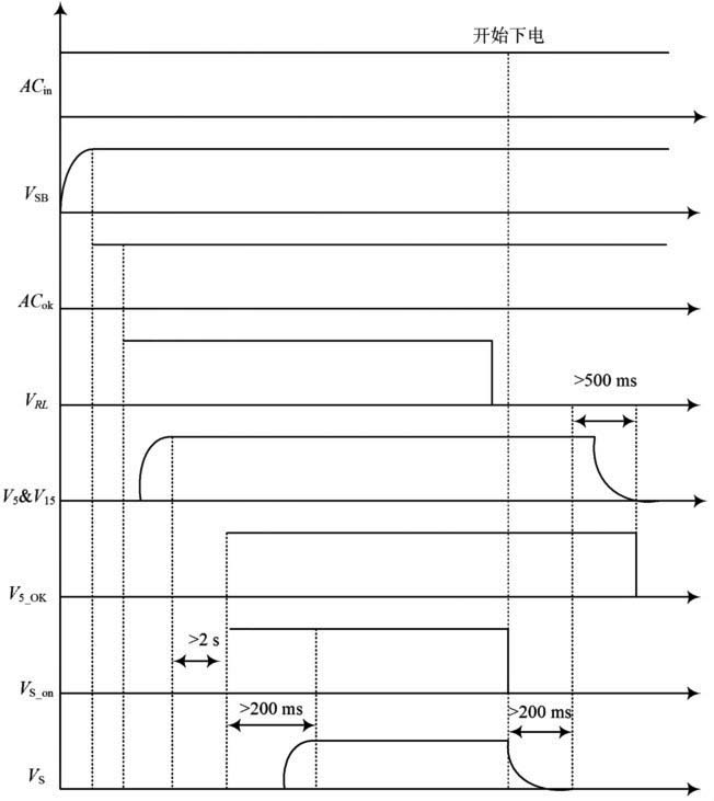 PDP電源在工作時,具有嚴格的開機時序和關(guān)機時序。當(dāng)插上整機電源插頭后,輸出待機電源VSB,同時交流信號檢測ACOK=1.此時按下開關(guān)。數(shù)字電路CPU向電源發(fā)出電源控制信號,使VRL =1,電源向各種邏輯電路、控制電路、保護電路提供+5V,+15V電源,然后將V5_ok置1.當(dāng)電源檢測信號V5_ok=1時,數(shù)字電路CPU向電源發(fā)出VS_on=1.PDP電源向顯示系統(tǒng)提供180V高壓。關(guān)機時,先關(guān)掉高壓電源,然后再關(guān)掉+5 V,+15 V 電壓。工作時序如圖2所示。