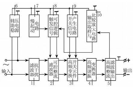 如圖1所示,它由抗干擾濾波器1、可控整流濾波器2、高頻變換開關(guān)元件3、高頻諧振變換器4、高頻整流濾波輸出5依次連接而成。可控整流濾波器2的導(dǎo)通角的控制由觸發(fā)信號(hào)控制邏輯8完成。慢起動(dòng)電路7使觸發(fā)信號(hào)控制邏輯8在開機(jī)時(shí)的導(dǎo)通角由零度逐步上升。輸出取樣與比較放大電路10,將高頻整流濾波輸出5的輸出電壓與基準(zhǔn)電壓源相比較且進(jìn)行放大,從而控制觸發(fā)信號(hào)控制邏輯8,使輸出電壓穩(wěn)定。改變基準(zhǔn)電壓源的大小,就能改變觸發(fā)信號(hào)控制邏輯8的觸發(fā)導(dǎo)通角,從而調(diào)節(jié)輸出電壓的大小。開關(guān)信號(hào)產(chǎn)生電路9產(chǎn)生一個(gè)適合高頻諧振變換器4的方波信號(hào),用來控制高頻變換開關(guān)元件3的導(dǎo)通和截止,使直流電能進(jìn)入高頻諧振變換器4,形成高頻電流震蕩;并經(jīng)高頻變壓器輸出至高頻整流濾波輸出5,減小了開關(guān)噪聲。輔助穩(wěn)壓電源6給慢起動(dòng)電路7、觸發(fā)信號(hào)控制邏輯8、開關(guān)信號(hào)產(chǎn)生電路9、輸出取樣與比較放大電路10提供能量和基準(zhǔn)電。