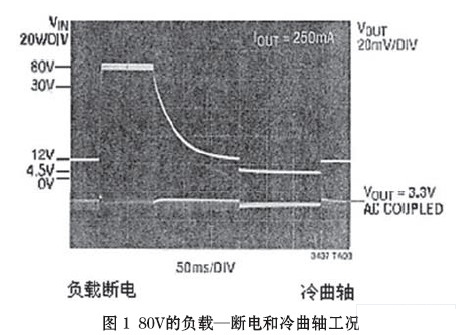 “冷曲軸”(cold crank)段,發(fā)生在汽車發(fā)動(dòng)機(jī)經(jīng)受冷卻或凝固期間,發(fā)動(dòng)機(jī)油變的非常粘滯。因而要求起動(dòng)機(jī)輸出更大的轉(zhuǎn)矩,相繼需要蓄電池提供更大的電流。這一大的電流負(fù)載導(dǎo)致蓄電池/一次母線的電壓降低,甚至低于4V的點(diǎn)火電壓。隨后,又回復(fù)至額定電壓13.8V(圖1)。這在某些應(yīng)用場(chǎng)合,例如發(fā)動(dòng)電機(jī)控制、安全系統(tǒng)和導(dǎo)航系統(tǒng)均不可避免。故要求具有良好調(diào)節(jié)的輸出電壓(一般為3.3V)貫穿“冷曲軸”段,以實(shí)現(xiàn)全過(guò)程的無(wú)間斷(連續(xù))運(yùn)行。