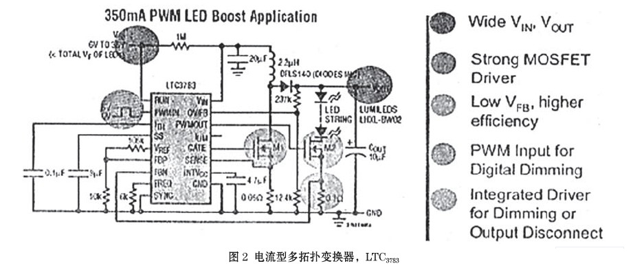 裝有LTC3783 LED驅(qū)動(dòng)器在汽車上應(yīng)用時(shí),具有以下很重要的特點(diǎn):(1)大電流、為輸出大的電流(≥1.5A),LTC3783驅(qū)動(dòng)外部的N溝道MOSFET,可給高亮度(HB)和超高亮度(SHB) LED供電;(2)高電壓、LTC3783 3V~36V的輸入運(yùn)作和輸出電壓,取決于外部功率元件的選擇,這可按標(biāo)準(zhǔn)確定,易于驅(qū)動(dòng)LED燈串或混串(串+并);(3)保護(hù)。對(duì)HB LED的保護(hù),需要IC結(jié)合精確的電流和輸出電壓調(diào)節(jié)。附加保護(hù)包括過(guò)電壓、過(guò)電流和軟啟動(dòng);(4)調(diào)光、以純色PWM3000∶1數(shù)字式調(diào)光時(shí),在寬廣的調(diào)光比下保持LED恒定的顏色。而且,LTC3783還能附加模擬100∶1的調(diào)光。