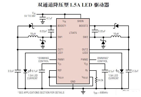 另一種產(chǎn)品LTC3475是雙通道36V、2MHz降壓式DC/DC變換器(圖3)。設(shè)計(jì)用于恒電流LED驅(qū)動(dòng)電路,能提供每通道1.5A的LED電流。內(nèi)部的傳感電阻器和調(diào)光控制,確保理想的驅(qū)動(dòng)大電流LED,可在50mA~1.5A的電流范圍內(nèi),保持高精度的輸出電流,而均勻、純色的PWM電路,能實(shí)現(xiàn)3000∶1的調(diào)光范圍。