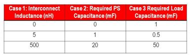 表1對舉例系統(tǒng)三個互連電感的要求電容器進行了比較。通過改變互連電感、計算負載旁路電容并設計電源的相應輸出級和控制環(huán)路,得到比較數(shù)據(jù)。案例1的負載和電源并列放置;案例2電源和負載之間的互連電感大小為中等。案例3中,使用線纜連接的電源的電感極高。要求旁路的多少直接與互連電感有關(guān)。