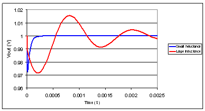 圖 2 對小和大互連電感的負載瞬態(tài)期間的輸出電壓變化模擬情況進行了比較。小電感響應快速漸次減弱,而大電感則并非如此,花費了較長的時間才穩(wěn)定下來。這是由于特性阻抗更高以及諧振頻率更低。另外,如果負載電流在該諧振頻率有規(guī)律地跳動,則會出現(xiàn)極寬且具破壞性的電壓變化。