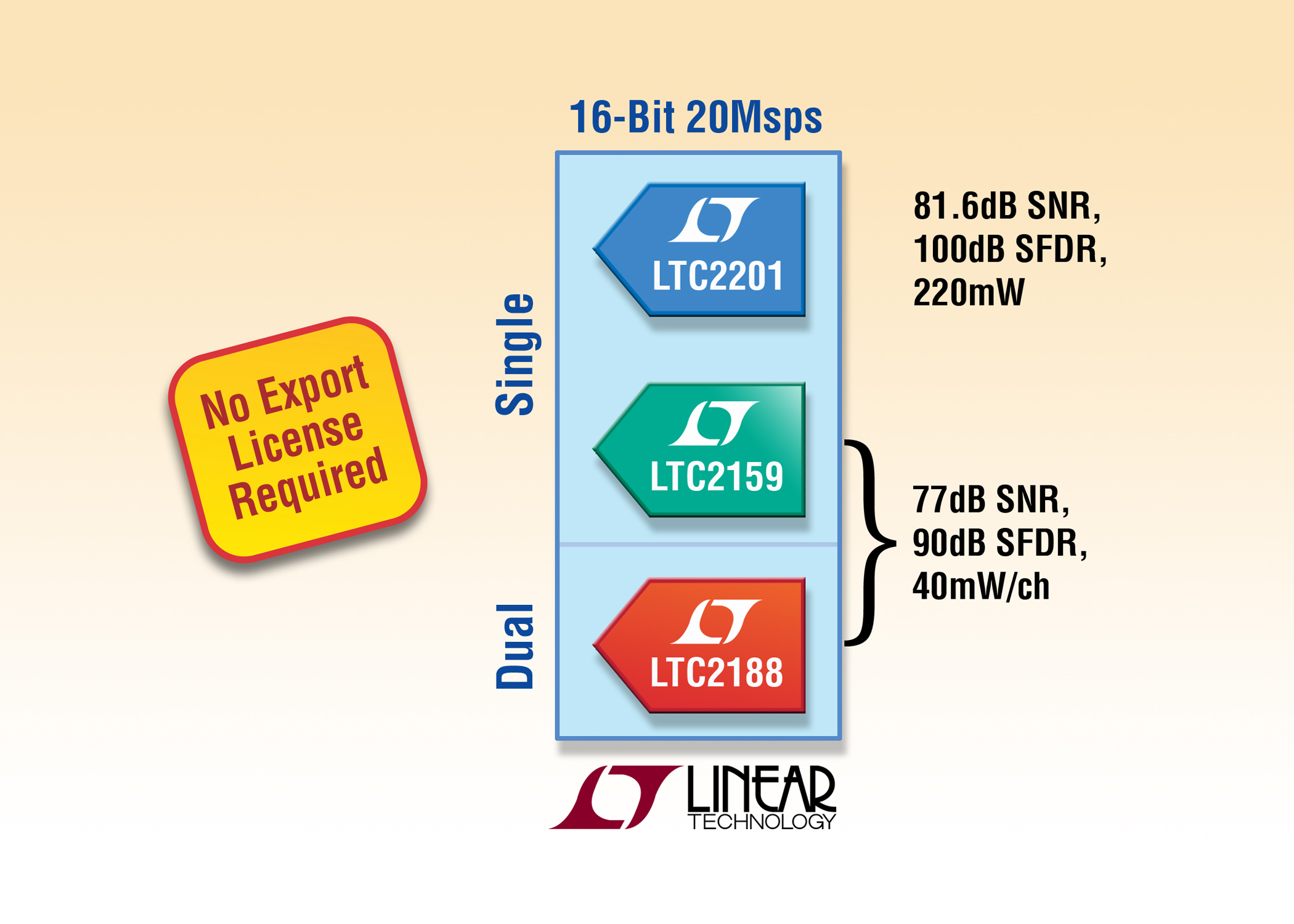 近日,凌力爾特公司 (Linear Technology Corporation) 非常高興地宣布三款新的 16 位 20Msps ADC 擁有出口管制分類號 (ECCN) 3A991,因此這些器件無需美國的出口許可證,就可向中國、俄羅斯以及其他有關國家供貨。