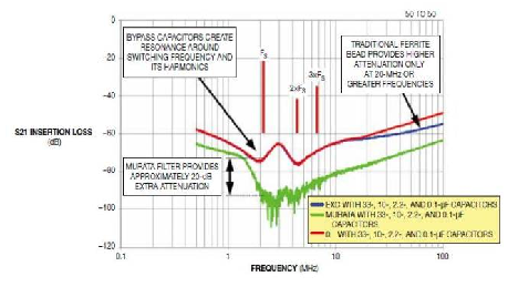 電源濾波器中的其它元件是旁路電容。選擇這些電容值時(shí),應(yīng)使它們的諧振頻率(產(chǎn)生一個(gè)接地的低阻抗路徑)接近于開關(guān)頻率。這樣,通過磁環(huán)的開關(guān)噪聲就被短路到地。圖2的電源濾波器插入損耗比較表明,正確的旁路電容值可產(chǎn)生一個(gè)接近于開關(guān)頻率的諧振,即使是用于一只傳統(tǒng)鐵氧體磁環(huán),如EXCML32A680.不過,在低頻時(shí),如果將其與一只0Ω電阻放在一起,就沒有那么大差異了。另一方面,Murata EMI濾波器提供了圍繞開關(guān)頻率的大約20dB額外衰減。圖3中的電源濾波器使用了一只33μF鉭電容做寬頻去耦,而10μF、2.2μF和 0.1μF的陶瓷電容則有狹窄的諧振頻率。