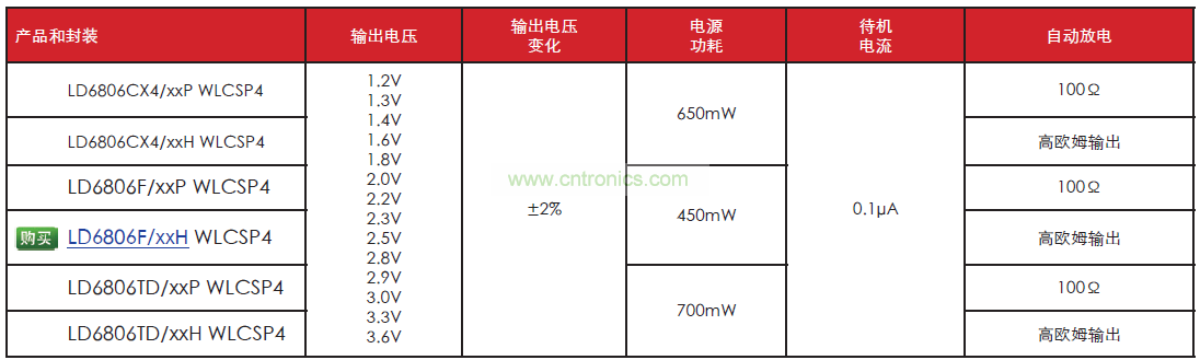 除了 0.76 毫米 x 0.76 毫米的 WLCSP4 封裝選項之外,LD6806 系列還可采用 1.0毫米 x 1.45 毫米 XSON6 以及 1.5 毫米 x2.9 毫米 SOT753 封裝。兩個變型均以各個封裝樣式提供,使設計人員能夠選擇適用于非放電應用的高歐姆輸出,或選擇自動放電變型,它配備有在設備處于禁用狀態(tài)時提供低歐姆輸出的下拉式開關晶體管。