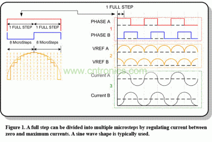 現(xiàn)在,很容易計算出我們馬達的微步進級別。將全步電流強度分成八個更小的電流量級后,馬達繞組受制于八個微步進度。換句話說,我們將1.8度除以8—因此每個微步現(xiàn)在便為0.225度。圖1顯示了通過在零和最大電流設置之間產生多個電流電平(典型正弦波波形后面),將一個全步分成八個微步的過程。