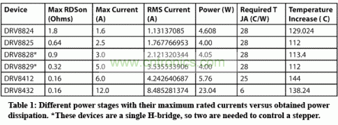 但是,利用更大的功率級,可以讓RDSon變得更小。這便是DRV8825的工作原理。0.64歐姆高端到低端的RDSon最大時,可以讓芯片溫度保持更低的同時提供更多的電流。如果使用了更大的功率級,且RDSon參數(shù)越來越小,則有望獲得更大的電流容量。表1顯示了使用不同器件時的各種電流容量。