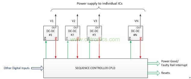 一個實現(xiàn)復雜的電源管理的常用方法(圖2)是使用DC-DC轉(zhuǎn)換器的電源良好信號,以監(jiān)測這個電源,并使用CPLD來實現(xiàn)定序算法(控制DC-DC轉(zhuǎn)換器的使能信號)。CPLD也產(chǎn)生監(jiān)測信號,如電源就緒/故障電壓中斷和復位信號。