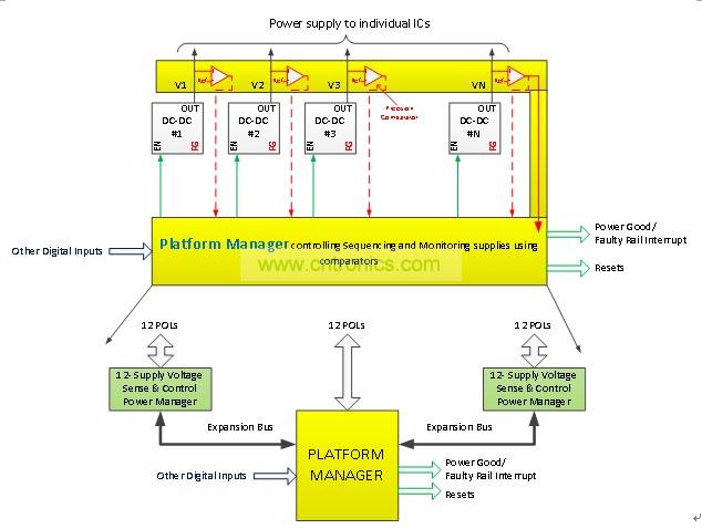 要求CPLD對電路板上超過12個電壓實現(xiàn)電源管理功能,如定序,復位產(chǎn)生等功能。這些設(shè)計取決于電路板上按裝的DC-DC轉(zhuǎn)換器產(chǎn)生的電源良好信號,用以監(jiān)控這些電壓。然而,精度差的這些電源良好信號會導致電路板功能的可靠性大大降低。增加電路板的可靠性可以通過用精確的比較器替代這些電源良好信號,監(jiān)控DC-DC轉(zhuǎn)換器的實際輸出電壓。