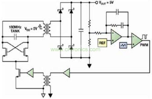 微變壓器可以用于提供集成的信號和電源隔離,最大額定值為5 kV rms [1]。對于信號傳輸,輸入數(shù)據(jù)通常在編碼之后再傳輸給數(shù)據(jù)變壓器原邊。副邊則通過解碼來還原信號。輸入與輸出之間的隔離通過初級線圈與次級線圈之間的絕緣層來實現(xiàn)。為了在隔離之間實現(xiàn)高效的電源傳輸,用一個自振高頻振蕩器來驅(qū)動電源變壓器的原邊,同時用高頻肖特基二極管來提供整流直流電壓。調(diào)節(jié)由次級控制器產(chǎn)生的PWM完成,該PWM通過一個反饋變壓器以遠低于振蕩頻率的頻率來開啟和關閉振蕩器,如圖2(a)所示。通過反饋變壓器的反饋信號的工作方式與通過數(shù)據(jù)變壓器