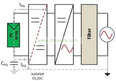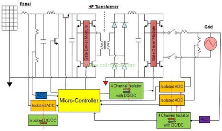 市場上主要有兩類PV逆變器,即無變壓器逆變器和變壓器隔離逆變器。無變壓器逆變器可能會受到大接地漏電流和注入的直流的影響,因為PV電池板與交流網(wǎng)之間存在很大的電池板電容而且缺少隔離,如圖1(a)所示。如果有直流組分注入電網(wǎng)中的交流電流中,這種情況是應該避免的,因為結(jié)果可能導致配電變壓器飽和。許多安全標準對電網(wǎng)中注入的直流電流量進行了嚴格的規(guī)定,有些情況下,必須對變壓器進行隔離。在電池板與電網(wǎng)之間采用變壓器隔離技術(shù)可以消除因電池板相對于電網(wǎng)的電壓差而產(chǎn)生的直流注入路徑,如圖1(b)所示。除直流注入以外,并網(wǎng)逆變器還需滿足電網(wǎng)的其他要求,比如總諧波失真和單諧波電流水平、功率系數(shù)以及孤網(wǎng)運行情況的檢測等。電網(wǎng)電壓和注入電網(wǎng)的電流必須精確監(jiān)控。如果用于執(zhí)行MPPT和柵極驅(qū)動功能的控制器位于電池板一端,則必須將這些測量值隔離開來。為了使PV電池板發(fā)揮最大效率,需采用最大功率點跟蹤(MPPT)算法。為了實現(xiàn)MPTT,還需監(jiān)控電池板電壓和電流。當人們嘗試串聯(lián)多個PV逆變器以減少所需逆變器的數(shù)量時,電池板電壓可能變得非常高。從PV電池板高邊端進行的電流測量也需要隔離。除了隔離電流和電壓測量以外,還需要RS-485、RS-232和CAN等接口功能。RS-485或RS-232一般用于面向這些PV逆變器的通信,以獲得實時的性能數(shù)據(jù),而通信總線則需要進行隔離,因為總線需要傳輸較長的距離,同時也是出于安全考慮。對于通信距離較短時,也可使用隔離CAN。這些收發(fā)器也需要把隔離電源從電池板一端抽取至總線一端。