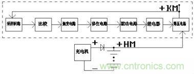 如圖2圖3示 ,合閘母線(+HM)經(jīng)過硅降壓回路降壓后,形成正控制母線(+KM),+KM經(jīng)自動調(diào)壓回路采樣后,采樣值送到比較判斷回路,在此處進行比較。如果+KM沒有高于預(yù)先設(shè)好的范圍,則觸發(fā)電路不動作。移位執(zhí)行電路也不動作,相應(yīng)的繼電器也不動,電路保持原狀態(tài),+KM值保持不變,如果+KM超出了預(yù)先設(shè)好的范圍,則比較判斷回路發(fā)出信號,告之觸發(fā)電路,觸發(fā)電路立即發(fā)出脈沖,觸發(fā)移位寄存器,移位寄存器開始向左或向右執(zhí)行移位,從而使電路驅(qū)動繼電器動作。繼電器相應(yīng)的節(jié)點打開或閉和,來實現(xiàn)硅二極管是串入還是脫離+KM回路,于是實現(xiàn)+KM按電力標準規(guī)定的范圍內(nèi)變化,從而實現(xiàn)了自動調(diào)節(jié)+KM電壓。