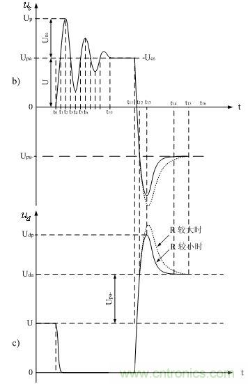 到t4時(shí)刻之后,輸入電壓ui對分布電感Ls和分布電容Cs進(jìn)行充電的過程,以及分布電感Ls和分布電容Cs互相進(jìn)行充電的過程,與t0~t4時(shí)刻基本相同。但由于在此期間,輸入電壓的上升率等于0,輸入電壓不再向分布電感Ls和分布電容Cs提供能量,因此,分布電感Ls與分布電容Cs產(chǎn)生自由振蕩的幅度是隨著時(shí)間衰減的,其衰減速率與等效電阻大小有關(guān)。