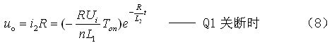 (8)式中,L1、L2分別為開關(guān)變壓器初、次級線圈的電感,n為開關(guān)變壓器線圈的匝數(shù)比,n=N2/N1,Ui為變壓器初級線圈的輸入電壓,Ton為開關(guān)管的導(dǎo)通時(shí)間,R為等效負(fù)載電阻。