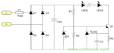 C1為降壓電容器, D1, 2, 3, 4為橋式整流二極管, ZD1是穩(wěn)壓二極管, R1為關斷電源后C1的電荷泄放電阻。