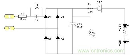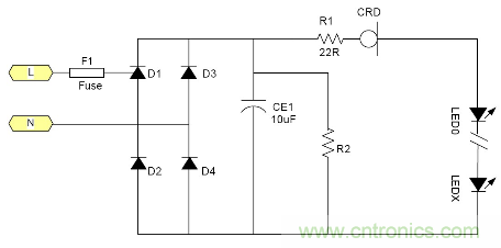 由于恒流二極管需要一定的電壓Vk才能夠進入恒流, 所以太低的電源電壓是無法工作的。通常這個Vk大約在5-10V左右 所以大多數(shù)采用電池供電的LED是無法工作的, 最大電流由于恒流二極管的功耗受到限制, 所以過大的電流也是不合適的。例如1W的LED通常需要350mA, 恒流二極管就很難提供, 目前比較合適的使用場合就是交流市電供電的LED燈具采用很多小功率LED串聯(lián)也就是高壓小電流的情況是最為合適;但是由于恒流二極管的耐壓有一定的限制 所以它所能吸收的電源電壓變化也是有限的。就拿100V耐壓的CRD來說用在220V市電電源里都還只能對付有限的電壓變化。220V經(jīng)過橋式整流以后它的輸出直流電壓大約為264V.如果市電變化+10% ~-15%就相當于整流后為290~187V, 電壓變化103V.已經(jīng)超過其耐壓了。因為LED伏安特性的非線性 所以很難用公式來表示??傊斒须婋妷航档蜁rLED中的電流就會隨市電電壓的降低而降低。其亮度也會跟著變。 典型應用電路中圖3為典型的應用電路, 圖4為加了阻容降壓的應用電路為了應對低電壓的輸出場合。