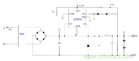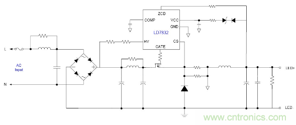 隨著目前法規(guī)和能效的需求, 針對LED應用提出高PF以及適應全電壓范圍都能可靠工作的要求, 并且朝小型化方面發(fā)展, 因此之前的填谷式的PFC電路也需要增加兩個高壓電容因體積的限制不太適合應用。有鑒如此, 國內(nèi)外很多廠商都推出了適應球泡燈和T管之類的非隔離電源應用驅(qū)動方案, 下面就以通嘉科技的LD7832做為典型介紹。