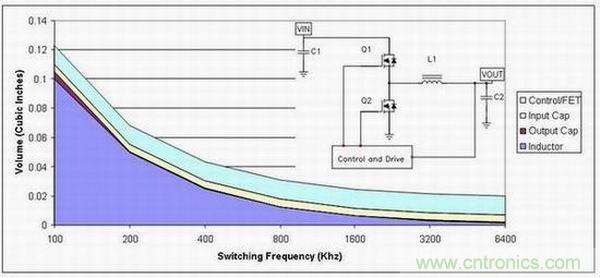 圖1顯示的是降壓電源頻率與體積的關(guān)系。頻率為100 kHz時,電感占據(jù)了電源體積的大部分(深藍色區(qū)域)。如果我們假設(shè)電感體積與其能量相關(guān),那么其體積縮小將與頻率成正比例關(guān)系。由于某種頻率下電感的磁芯損耗會極大增高并限制尺寸的進一步縮小,因此在此情況下上述假設(shè)就不容樂觀了。如果該設(shè)計使用陶瓷電容,那么輸出電容體積(褐色區(qū)域)便會隨頻率縮小,即所需電容降低。另一方面,之所以通常會選用輸入電容,是因為其具有紋波電流額定值。該額定值不會隨頻率而明顯變化,因此其體積(黃色區(qū)域)往往可以保持恒定。另外,電源的半導(dǎo)體部分不會隨頻率而變化。這樣,由于低頻開關(guān),無源器件會占據(jù)電源體積的大部分。當(dāng)我們轉(zhuǎn)到高工作頻率時,半導(dǎo)體(即半導(dǎo)體體積,淡藍色區(qū)域)開始占據(jù)較大的空間比例。