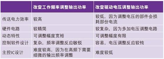 在諧振系統(tǒng)中調(diào)整功率的方式另外還有改變線圈上的電感值或電容值的方法,但在實(shí)際量產(chǎn)上并不容易完成所以不被采用。在圖(五)是無(wú)線充電聯(lián)盟規(guī)格書(shū)中所提的兩種控制發(fā)射線圈輸出功率的方法,第一種是變頻調(diào)整式,另一種則是變壓調(diào)整式。