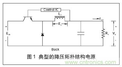 圖1所示為一個(gè)降壓拓?fù)浣Y(jié)構(gòu)電源的架構(gòu),該構(gòu)架廣泛應(yīng)用于輸出電壓小于輸入電壓的系統(tǒng)。在典型的降壓拓?fù)浣Y(jié)構(gòu)電路中,當(dāng)開關(guān)(Q1)閉合時(shí),電流開始通過這個(gè)開關(guān)流向輸出端,并以某一速率穩(wěn)步增大,增加速率取決于電路電感。根據(jù)楞次定律,di=E*dt/L,流過電感器的電流所發(fā)生的變化量等于電壓乘以時(shí)間變化量,再除以這個(gè)電感值。由于流過負(fù)載電阻RL的電流穩(wěn)定增加,輸出電壓成正比增大。