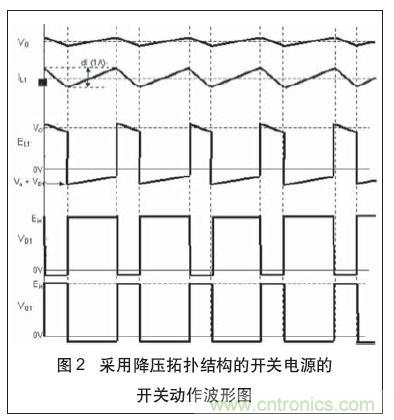 在達(dá)到預(yù)定的電壓或電流限值時(shí),控制集成電路將開關(guān)斷開,從而使電感周圍的磁場衰減,并使偏置二極管D1正向?qū)?,從而繼續(xù)向輸出電路供給電流,直至開關(guān)再度接通。這一循環(huán)反復(fù)進(jìn)行,而開關(guān)的次數(shù)由控制集成電路來確定,并將輸出電壓調(diào)控在要求的電壓值上。圖2所示為在若干個(gè)開關(guān)循環(huán)周期內(nèi),流過電感器和其它降壓拓?fù)潆娐吩系碾妷汉碗娏鞑ㄐ巍?/p>