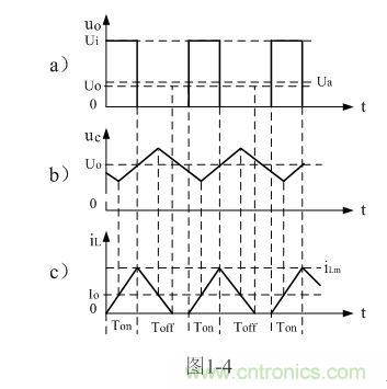 圖1-6是串聯(lián)式開(kāi)關(guān)電源工作于電流臨界連續(xù)狀態(tài)時(shí),串聯(lián)式開(kāi)關(guān)電源電路中各點(diǎn)電壓和電流的波形。圖1-6中,Ui為電源的輸入電壓,uo為控制開(kāi)關(guān)K的輸出電壓,Uo為電源濾波輸出電壓,iL為流過(guò)儲(chǔ)能濾波電感電流,Io為流過(guò)負(fù)載的電流。圖1-6-a)是控制開(kāi)關(guān)K輸出電壓的波形;圖1-6-b)是儲(chǔ)能濾波電容C的充、放電波形;圖1-6-c)是流過(guò)儲(chǔ)能濾波電感電流iL的波形。當(dāng)串聯(lián)式開(kāi)關(guān)電源工作于電流臨界連續(xù)狀態(tài)時(shí),控制開(kāi)關(guān)K的占空比D等于0.5,流過(guò)負(fù)載的電流Io等于流過(guò)儲(chǔ)能濾波電感最大電流iLm的二分之一。