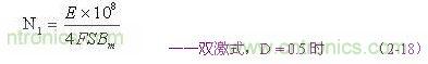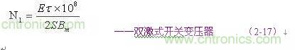 (2-17)和(2-18)式,為計算雙激式開關變壓器初級線圈N1繞組匝數的公式。式中,N1為變壓器初級線圈N1繞組的最少匝數,S為變壓器鐵芯的導磁面積(單位:平方厘米),Bm為變壓器鐵芯的最大磁感應強度(單位:高斯),τ為脈沖寬度,或電源開關管的導通時間(單位:秒),E為脈沖電壓的幅度,單位為伏,F(xiàn)為開關電源的工作頻率,單位赫芝。