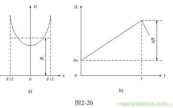 圖2-20-a和圖2-20-b分別是由(2-56)式給出的,鐵芯片中磁場強度按水平方向分布的函數(shù)H(x)和按時間分布的函數(shù)H(t)曲線圖。
